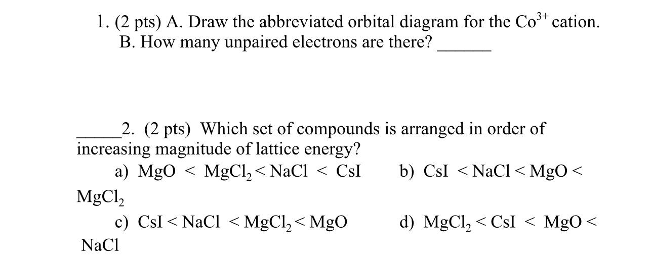 By Hund's rule, the electron configuration of carbon, which is 1s2 2s2 2p2, is understood to correspond to the orbital diagram shown in c. Experimentally, it is found that the ground state of a neutral carbon atom does indeed contain two unpaired electrons. Which of the following has maximum number of unpaired electrons fe3+ Fe2+ Co2+ Co3 ...