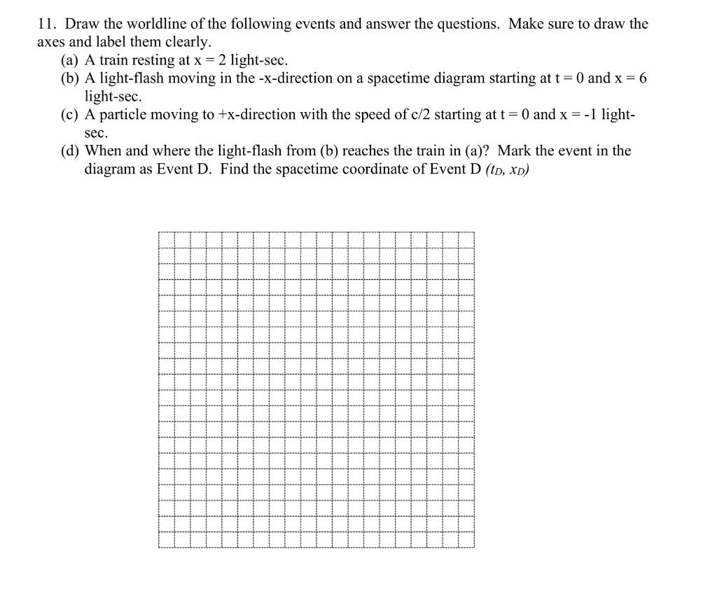Make a spacetime diagram and draw worldlines for each of the following situations.. In the jargon of spacetime diagrams, the green point on Tom’s and Sarah’s plots is an event and the red or blue trajectories are worldlines. An event is anything that can be characterized by a single point on a spacetime diagram (or on a position vs time graph). An event must have both a time and a place, and Ray Skinner · 2014 · Science(b) Draw, on the space-time diagram of S, the curves 12 — x2 = 1 and 1:2 ... These events have r coordinates successively FIGURE 1.83 World lines of the ... Q. Make a spacetime diagram and draw worldlines for each of the following situationsA person driving by at a constant velocity of 50 km/hr. Solved • Oct 12, 2020 Graphing Position, Velocity, and Acceleration Graphs 24 Dec 2020 — Draw a spacetime diagram in Ann's reference frame depicting the world lines of both Bob and Chu, and label the important spacetime events ...