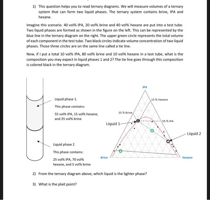 How to read a ternary diagram. Jul 14, 2000 · The sum result is the ternary diagram to the right with all the scales present. Note that the heavy red lines are not included in this final triangle. Also observe that the ternary diagram is read counter clockwise. So, some practice. Note the numbers 1 - 4 on the diagram. The composition for each of these points is shown below. See if you ... Piper diagram with TDS and point by point legend. Piper Diagrams contain 3 linked layers with normalized data. Customization options include adjusting the gap between ternary and rhomb, indexing symbol size and color, adding sample ID as label, and updating legend … A ternary plot, ternary graph, triangle plot, simplex plot, Gibbs triangle or de Finetti diagram is a barycentric plot on three variables which sum to a constant. It graphically depicts the ratios of the three variables as positions in an equilateral triangle.It is used in physical chemistry, petrology, mineralogy, metallurgy, and other physical sciences to show the compositions of systems ... Reading a ternary phase diagram. Now, you have understood some basics of a ternary diagram. Let’s move forward to details. As a ternary diagram represents three different substances, it is a three-dimensional plot drawn on a two-dimensional plane. Three vertices of the triangle represent three pure substances.