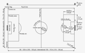 Diagram of a soccer field showing all parts of the field - goal box, penalty box, center circle, halfway line, corner arc, endline, sideline, etc.