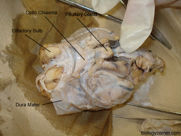 The sheep brain is exposed and each of the structures are labeled and described in a sequential manner, in the same way that a real dissection would occur. Sheep Brain Dissection. 1. The sheep brain is enclosed in a tough outer covering called the dura mater. You can still see some structures on the brain before you remove the dura mater.