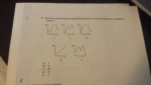 Select the potential energy diagram that represents a two-step endothermic (endergonic) reaction. I II III IV; Question: Select the potential energy diagram that represents a two-step endothermic (endergonic) reaction. I II III IV. This problem has been solved! See the answer See the answer See the answer done loading. Show transcribed image text