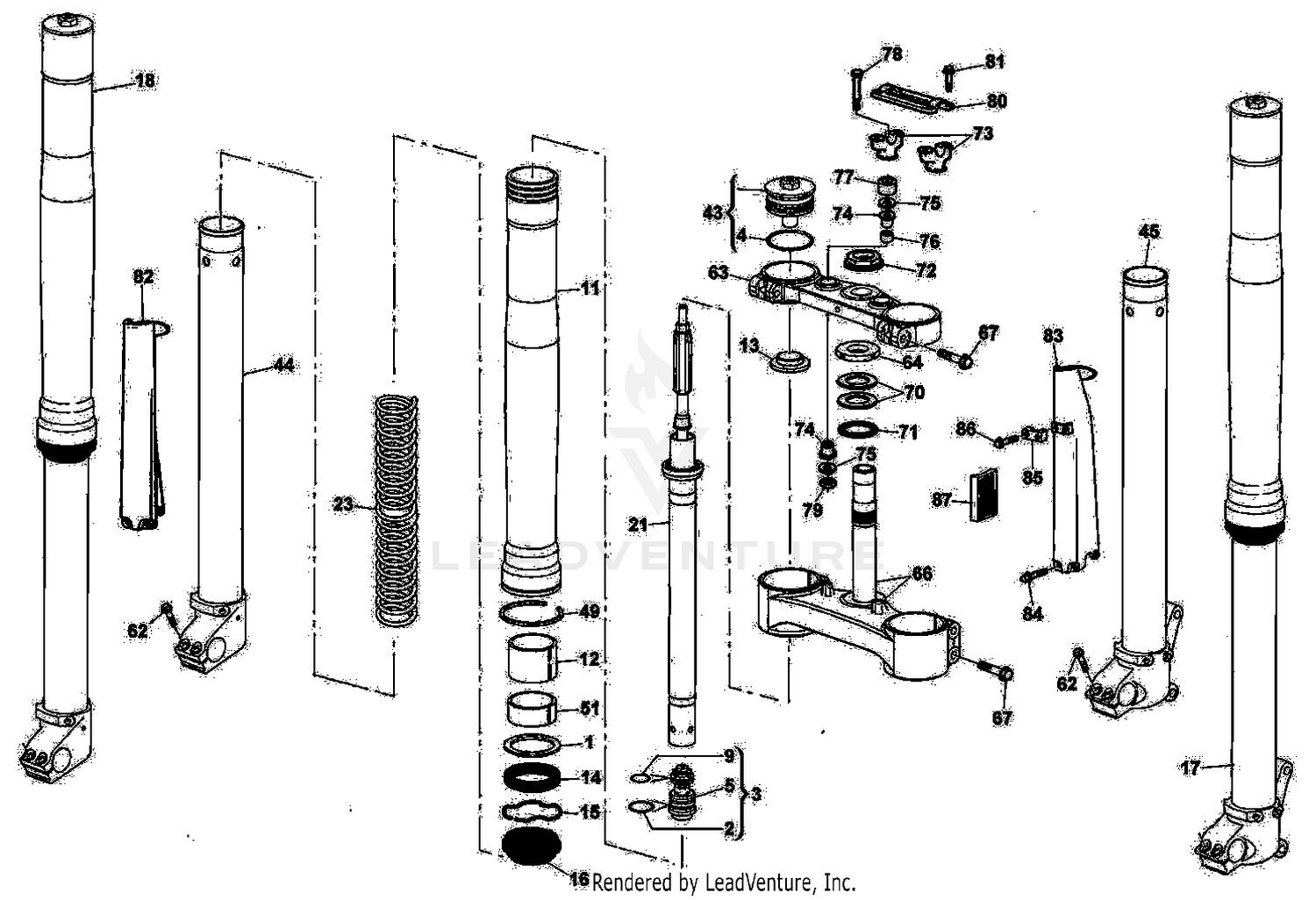 Dan's Motorcycle "Exploded Front Forks". Here are some exploded views of different motorcycle front forks for you to study. I will try to add more as time allows. 1981 Honda Goldwing Fork. Pre 1970 BSA Fork. CBX Honda Fork. Honda XR600R Fork. Typical Bultaco Fork. Ceriani Fork.