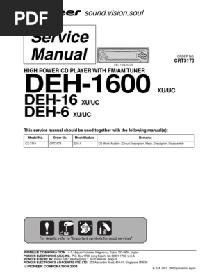 PIONEER DEH-6,16,1600 - Free download as PDF File (.pdf), Text File (.txt) or read online for free 3.2 overall connection diagram(guide page). Note: When ordering service parts, be 3. Remove the lead wires from the inner holder. 4. Remove the washer, styling holder, change arm, and...