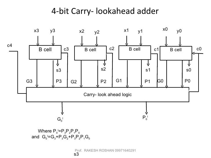 What is the purpose of using carry-look-ahead generator? Derive the Boolean equations and draw a 4 bit carry-look-ahead generator circuit. Question: 2. [3+2+2+3 = 10 points] Draw the logic diagram of a full adder circuit. Also show the carry propagator (Pi) and carry generator (Gi). What is the purpose of using carry-look-ahead generator? The circuit of 4-bit Manchester carry look-ahead adder is shown in Fig 3. Fig 3(a) and 3(b) are representing the circuit of propagate and generate signal provider to the adder. 4-bit Carry Look Ahead Adder - Free download as Powerpoint Presentation (.ppt), PDF File (.pdf), Text File (.txt) or view presentation slides online. We designed an 4-bit carry look ahead adder that operated at 200 MHz and used 16mW of Power and occupied an area of 420x440mm2 Introduction Why is a Carry Look Ahead Adder important? The CLA is used in most ALU designs It is faster compared to ... Ripple Carry Adder is used as the last block because the values don't have to be propagated to another block. To maintain regularity in the block diagram the term ';4-bit CLA block' is used. This is because the block is 4 bits wide and a block of the CLA. The block itself does not use Carry Look Ahead technique. It uses ripple carry technique.