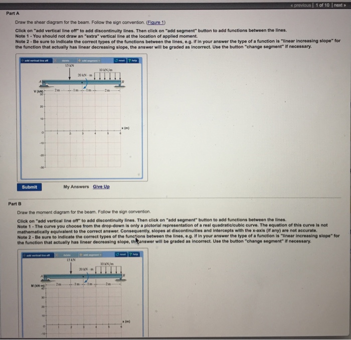 Problem 7.84 Draw the moment diagram for the beam. Follow the sign convention. Click on "add vertical line off" to add discontinuity lines. Then click on "add segment" button to add functions between the lines. Note 1 - Draw a vertical line to denote local maximum or minimum. Consider the beam shown in (Figure 1). Follow the sign convention. Draw the moment diagram for the beam. Click on "add vertical line off" to add discontinuity lines. Then click on "add segment" button to add functions between the lines. Note 1 - Draw a vertical line to denote local maximum or minimum. Civil Engineering. Civil Engineering questions and answers. Problem 7.77 Part A Draw the shear diagram for the beam. Follow the sign convention. (Figure 1) Click on "add vertical line off" to add discontinuity lines. Then click on "add segment" button to add functions between the lines Note 1- You should not draw an "extra" discontinuity line at the point where the curve passes the x-axis Note 2 Be sure to indicate. Draw the shear diagram for the beam follow the sign convention. 12 shear and moment functions. Draw the shear diagram for the beam. Figure 1 part b. Follow the sign convention click on add vertical line off to add discontinuity lines. Follow the sign convention. Draw the shear and moment diagrams for the compound beam shown in the figure.
