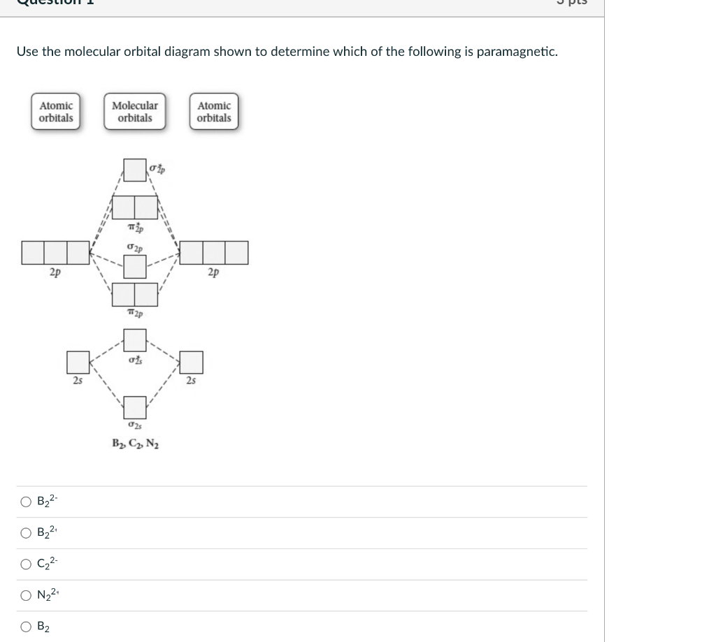 Solved Use the molecular orbital diagram shown to ... We review their content and use your feedback to keep the quality high. Transcribed image text: 10. Use the molecular orbital diagram shown to determine which of the following are paramagnetic Atomic orbitals Molecular orbitals Atomic orbitals pćµ 2p 2p P2p 2s /2s 2s A) B22 B) B22- C) N22 D) C22- E) B2.