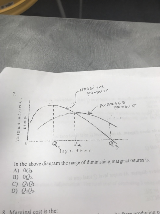 In the diagram, the range of diminishing marginal returns is:. In the diagram below, the range of diminishing marginal returns is: А. 00з. В. О2. C. Qi2 D. Qi Marginal Product Average Product Q2 Inputs of Labor o Marginal ...1 answer · Top answer: 13. Ans- d (Q1 - Q3) The marginal product measures the increase in output due to an additional input. The increase in output per unit increase in input ... Over the 0 to 4 range of output, the TVC and TC curves slope upward at a decreasing rate because of increasing marginal returns. The slopes of the curves then increase at an increasing rate as diminishing marginal returns occur.' (b) See the graph. The MB curves in the above diagram slope downward because of the law of: diminishing marginal ... Diminishing marginal returns primarily looks at changes in variable inputs and is therefore a short-term metric. Variable inputs are easier to change in a short time horizon when compared to fixed... Law of Diminishing Returns Defined The law of diminishing returns, also referred to as the law of diminishing marginal returns, states that in a production process, as one input variable is...