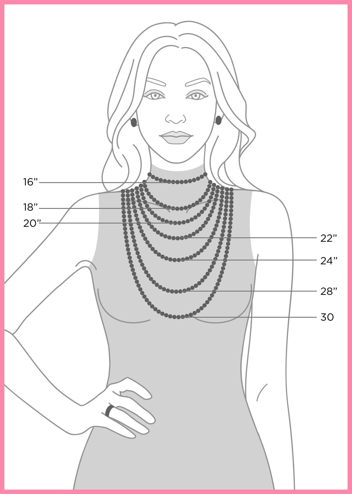 Chain Length & Width Guide - FrostNYC Learn about chain length to better understand sizing. See examples of chain length from 20 inches to 30 inches. We sell all types of chains, customize yours. Phone : 888-485-1061 ... Gold Necklace Under $350. Chain & Pendant Under $220 Gold Plated Necklace . All Gold Plated Necklace ... 36 Necklace length chart ideas | jewelry tutorials ... Jul 18, 2016 - Explore Tama's board "necklace length chart" on Pinterest. See more ideas about jewelry tutorials, jewelry techniques, necklace length chart. Necklace Length Guide: Pick Your Piece Confidently ... The size of your neck is another factor to consider when choosing a necklace length. A study of neck circumference indicates that the average neck size for a woman is about 31.5 cm or 12.5 inches. If your neck is considerably larger or smaller than this average, it may affect where different necklace lengths fall on your frame. › pages › necklace-length-diagramNecklace Length Diagram - Melissa Scoppa Necklace Length Diagram. The length of a necklace affects how it looks when you wear it. Always pay attention to necklace length when you’re purchasing jewelry, and be aware of how different necklace lengths look on you. Most pendants can not be switched to longer or shorter chains on your own and they would need to be sent in to us for the ...