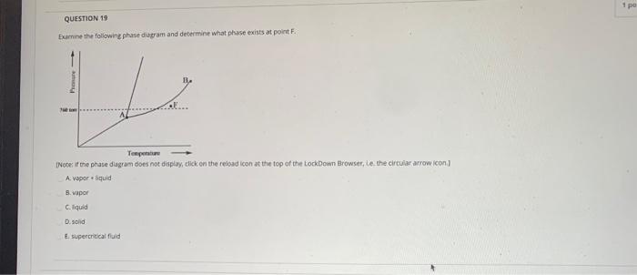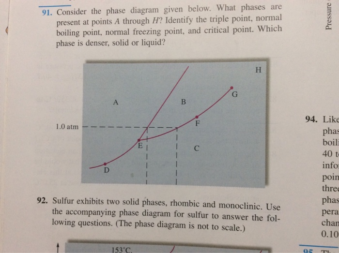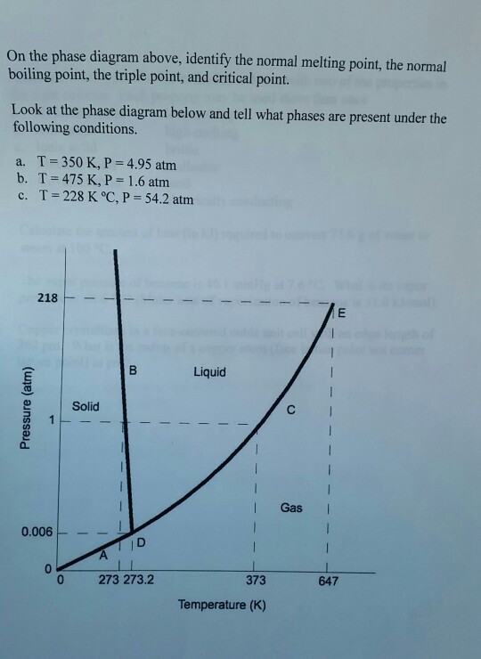 Examine the following phase diagram and determine what ... Examine the following phase diagram and determine what phase exists at point F. Previous Fill in each blank with the standard form of be, have, or do. Like me, the car ________ a problem dealing with freezing weather. Next Underline the standard verb form. Dan (climb, climbed) up on the roof to see where the water was coming in. Solved 12) Examine the following phase diagram and ... Question. : 12) Examine the following phase diagram and identify the feature represented by point A. 760 torr Temperature A) melting point B) critical point C) triple point D) sublimation point E) boiling point 13) In hydrogen iodide are the most important intermolecular forces A) B) C) dipole-dipole forces London dispersion forces hydrogen ...