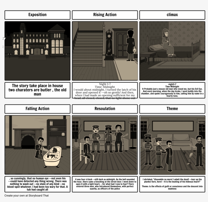 "The Tell-Tale Heart" Plot Diagram - Storyboard That Create a visual plot diagram of "Tell-Tale Heart". Separate the story into the Exposition, Conflict, Rising Action, Climax, Falling Action, and Resolution. Create an image that represents an important moment or set of events for each of the story components. Write a description of each of the steps in the plot diagram. Lesson Plan Reference