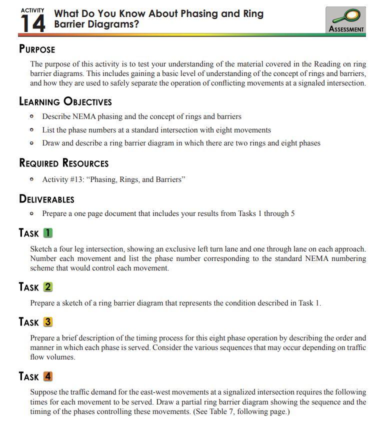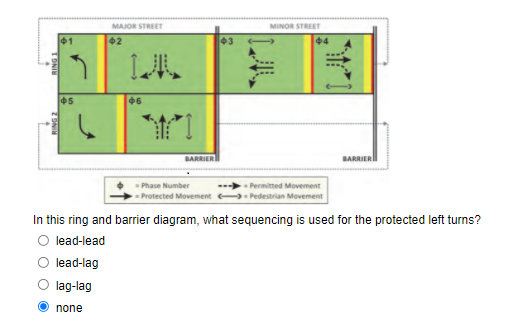 3 Whose Turn is it? Phasing, Rings, and Barriers Ring Barrier Diagram The ring barrier diagram speciļ¬ es the safe sequencing of phases (and thus the movements that they control) at a signalized intersection. We can construct the ring barrier diagram as follows. First, we separate the phases ACTIVITY13: PHASING, RINGS, ANDBARRIERS